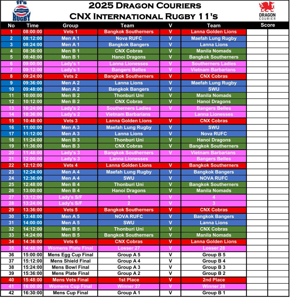 As Sunday is a free day, we will be hosting, with the Lanna Rugby Club youth development program, a rugby camp at the Suthep stadium with upwards of 100 kids. Any coaches or players that want to help out are welcome to join in the fun. 10am till 2pm+. Plan is skills and technique in the morning then have some games to finish off in the afternoon. There will be kids of all ages both boys and girls.